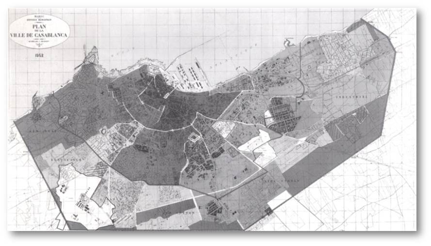 Par ailleurs, en se basant sur une étude démographique, l’objectif d’Ecochard n’était pas de refaire la ville, mais se focalisait sur l’orientation de sa croissance urbaine en forme radio-concentrique vers le sud, sud-ouest et du côté nord-est, tout en liant cette orientation au développement des zones industrielles sur un tracé linéaire en direction de la ville de Mohammédia, en intégrant la liaison autoroutière entre Casablanca et Rabat.